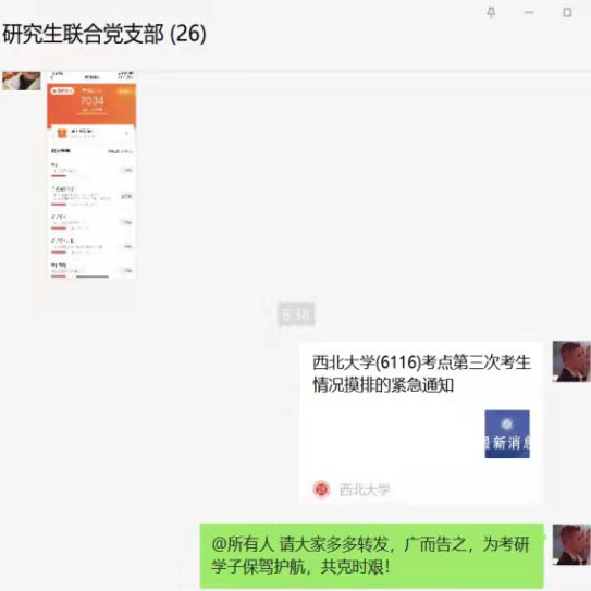 此外,研究生联合党支部以支部两个信息联络群为平台,教育党员在疫情防控特殊时期以身作则,争做表率,配合学校疫情防控大局,形成了良好的疫情防控合力与氛围。