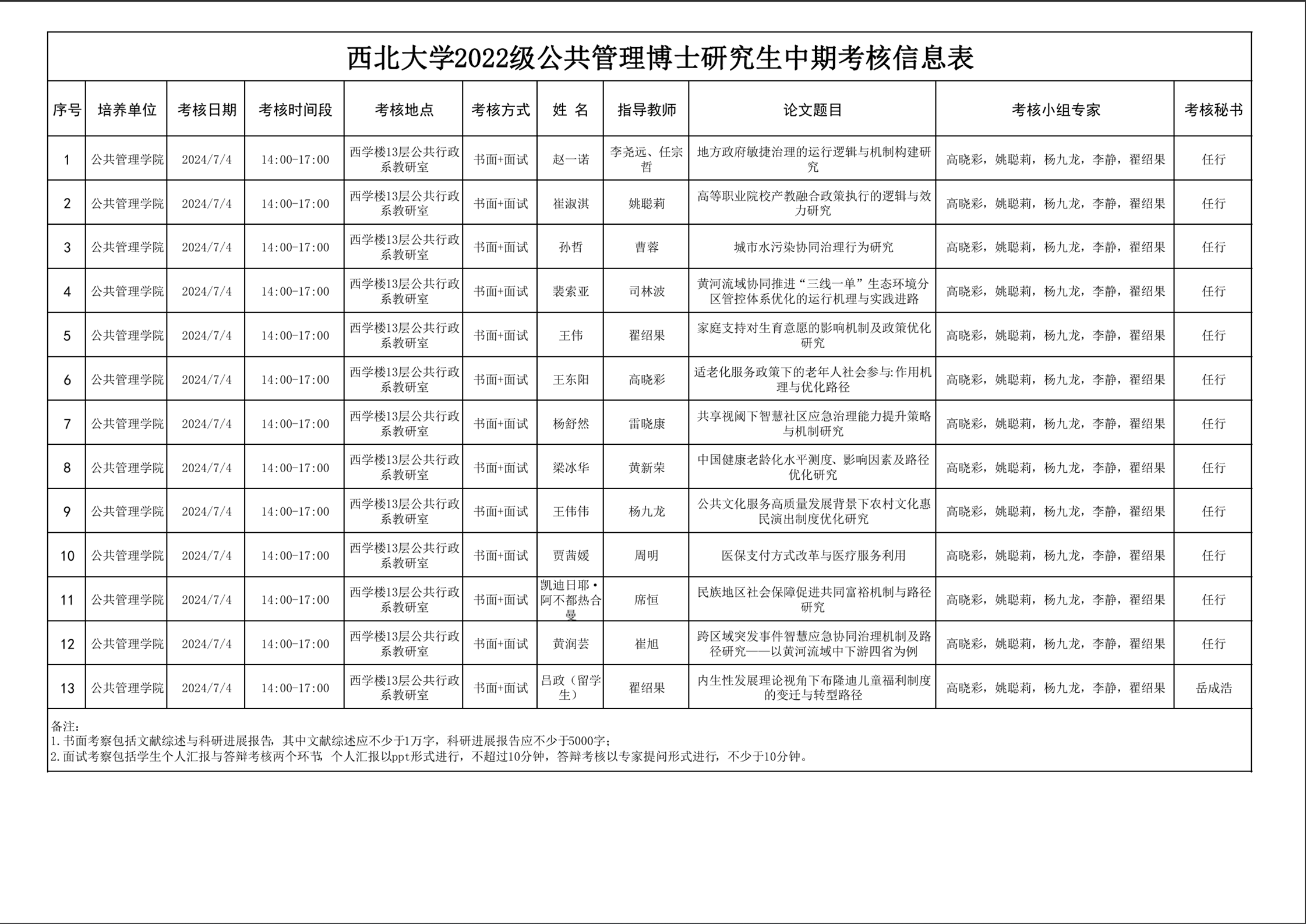 西北大学2022级公共管理博士研究生中期考核信息表