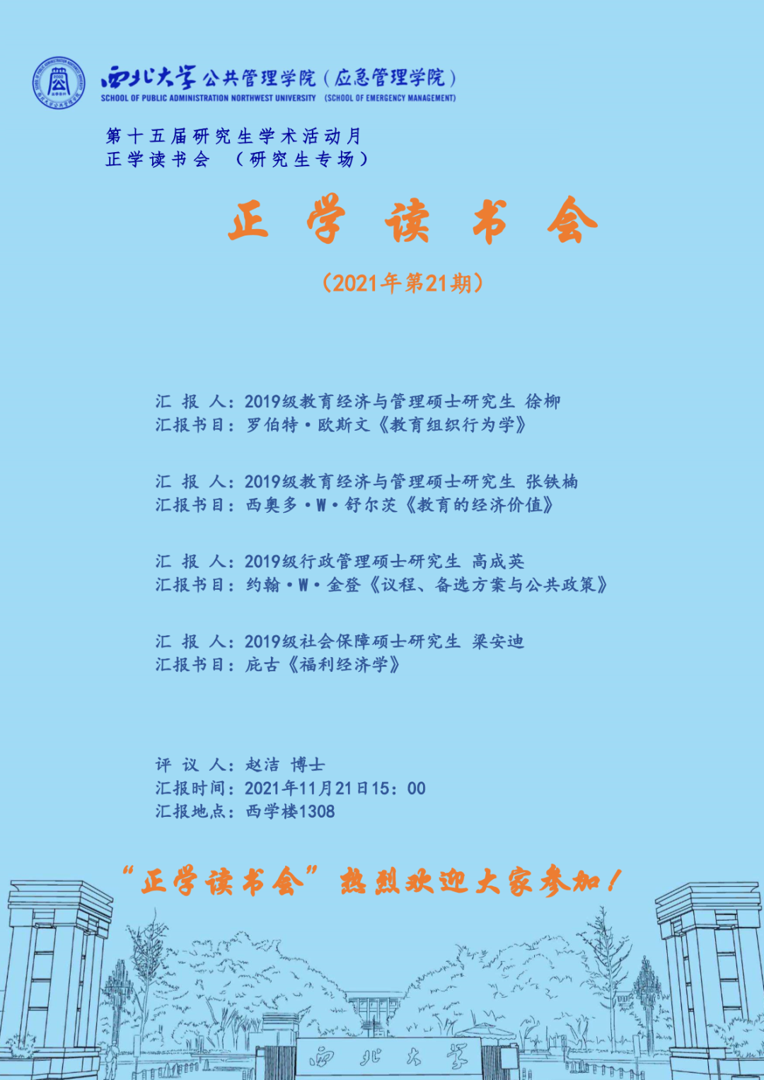 本期“正学读书报告会”由565net必赢2021级公共管理博士研究生赵洁担任评议人由2019级教育经济与管理专业研究生徐柳和张铁楠,2019级行政管理专业研究生高成英及2019级社会保障专业研究生梁安迪进行读书分享。