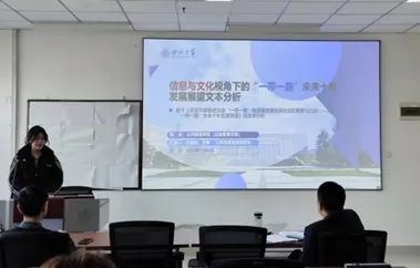 秦奎元讲师的研讨主题为《人类合作行为的神经基础》,秦老师以“合作”这一关键词的出现频率为引导,主要介绍了合作行为如何产生、合作行为的神经机制两个内容,从心理学的研究视角分析合作对于“一带一路”未来十年发展的意义,他指出,随着认知神经科学的发展,合作行为已经能够进行定量的研究。王若桢硕士研究生的研讨主题为《信息与文化视角下的“一带一路未来十年发展展望文本分析”》,她的汇报从政策背景、词频分析、关键主题词分析与思考四个方面展开,首先通过词频分析得到五个关键词,分别为:数字、创新、文化、信息、数据,再围绕关键词介绍各个领域的创新发展与未来愿景。