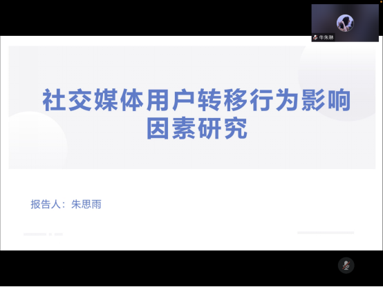 朱思雨同学汇报了《社交媒体用户转移行为影响因素研究》,研究从社交媒体平台用户流失的背景入手,基于PPM模型,选取疲劳、不满意、个人创新性、转移成本等影响因素,同时将网络外部性这一概念进行细分,综合考虑环境、个体、技术、成本因素,以问卷调查和结构方程模型结合为研究方法,对建立的模型进行了检验,最后根据假设检验的结果提出了优化对策,对社交媒体转移的影响因素进行了更深入的探究。王铮老师指出作为一个实证研究,该研究对数据进行了一系列的收集和分析,在后续研究中要注意数据的完善,同时要用文字对分析结果进行合适的表达,保证数据的质量。