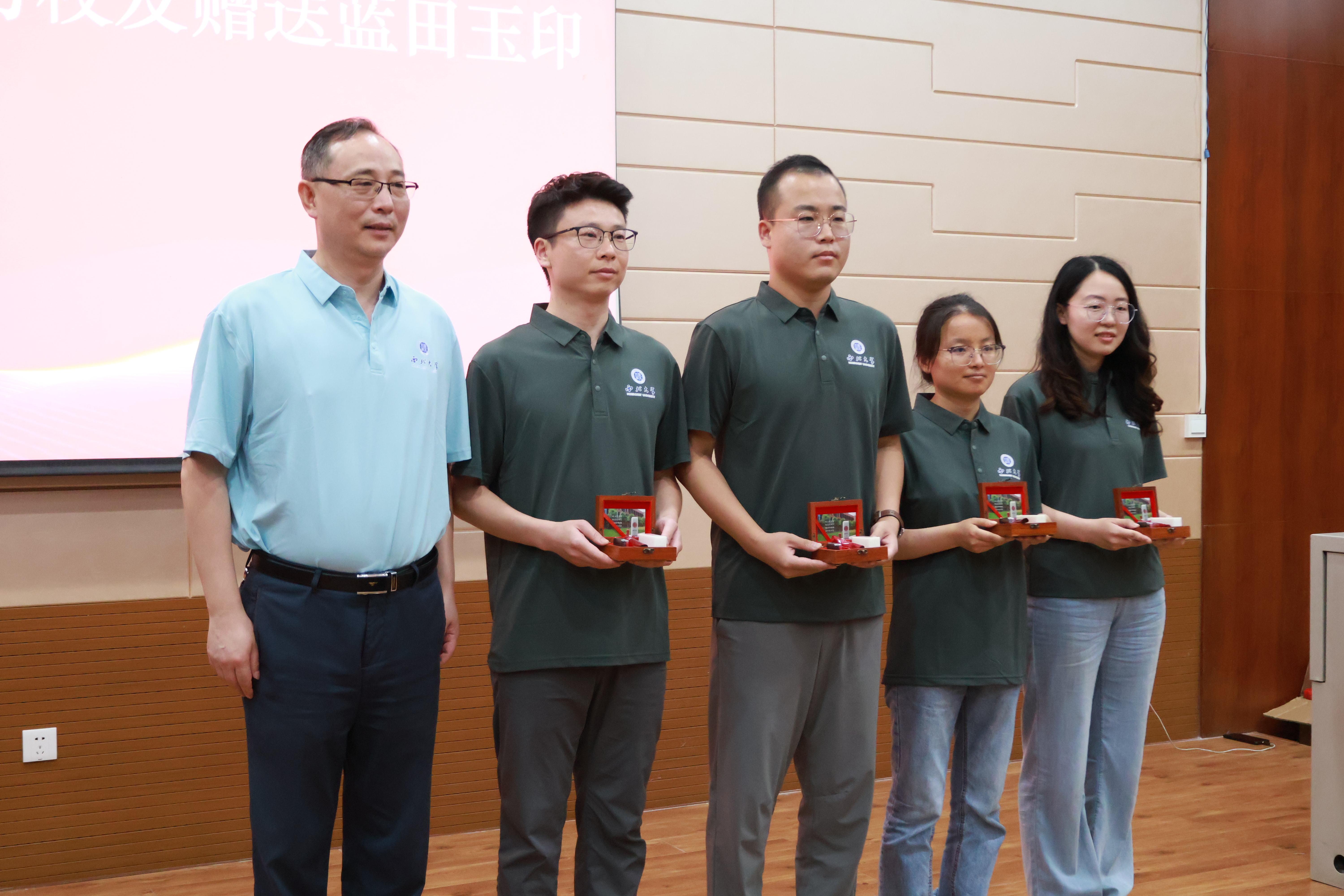 学院党委书记窦争光为校友赠送蓝田玉章。